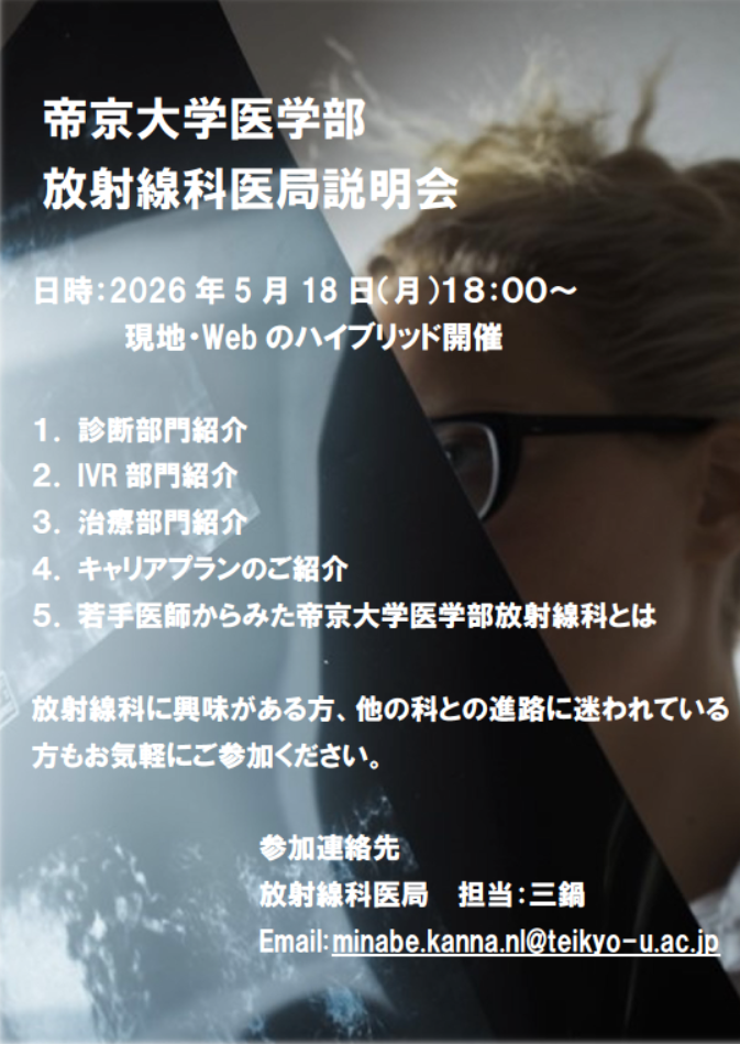 2026年度帝京大学医学部放射線科医局説明会のお知らせ 投稿日 2026年4月23日 更新日 2026年4月23日 カテゴリー お知らせ 2026年度帝京大学医学部放射線科医局説明会を開催いたします。 放射線科に興味のある方、他科との進路に迷われている方もお気軽にご参加ください。学生の方も大歓迎です。 参加ご希望の方はminabe.kanna.nl@teikyo-u.ac.jpにご連絡ください。